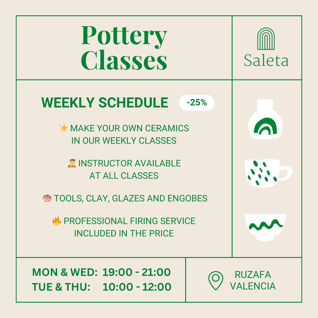 Aprende diferentes técnicas de construcción (pellizco, placas, rollos, tallado, etc.) y cómo esmaltar o decorar tus propias piezas. El servicio de cocción para todas tus piezas está incluido en el precio.